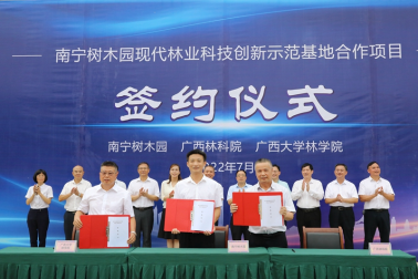 2022年7月20日,beat365平台官方网站与南宁树木园、广西林科院合作建设的南宁树木园现代林业科技创新示范基地的签约暨揭牌仪式在南宁树木园隆重举行。南宁树木园主任余注光、广西林科院院长陈崇征、beat365平台官方网站院长徐增富先后讲话并现场签约。