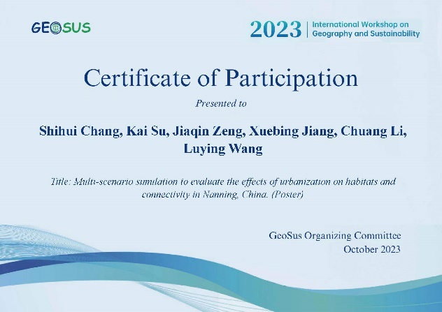 近日,beat365官网研究生常士慧收到地理学与可持续性国际学术会议(International Workshop on Geography and Sustainability,简称GEOSUS)邮寄来的获奖证书。