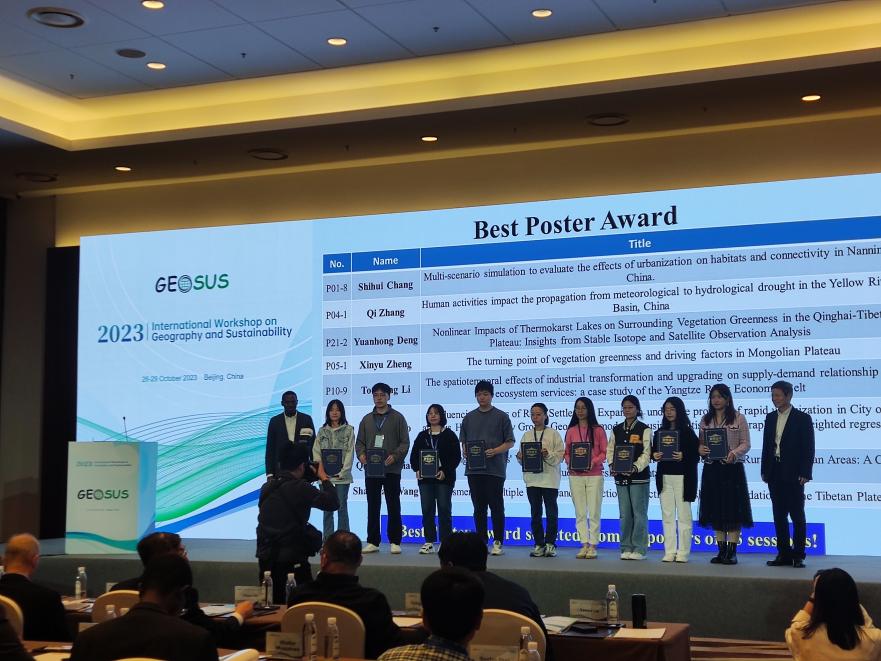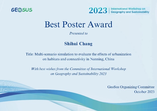 beat365官网研究生常士慧受邀参加2023 GEOSUS,以“Multi-scenario simulation to evaluate the effects of urbanization on habitats and connectivity in Nanning, China”为题进行墙报演讲,与参会人员开展了深入交流与讨论。研有所获,beat365官网研究生常士慧在墙报评比中获得“Best Poster Award”(最佳墙报奖)并登上颁奖台与颁奖嘉宾合影留念。