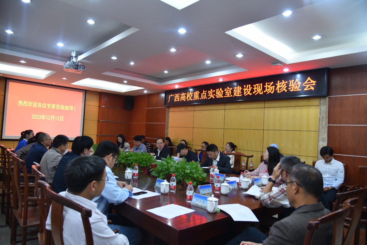 12月12日,广西壮族自治区教育厅专家组蒋伟、周岐海、覃国乐、李洋一行4人到校对beat365官网“广西高校亚热带人工林培育与利用重点实验室”、农学院“广西高校作物栽培与生理重点实验室”及动科院“广西高校动物疫病预防与控制重点实验室”进行现场核验。科研院平台建设管理处副处长魏万青、院党委书记符韵林、常务副院长叶绍明、副院长杨梅(重点实验室主任)、招礼军副院长、实验室学术委员会副主任徐增富及农学院、动科院有关领导、重点实验室主任和骨干成员参加了现场核验会。