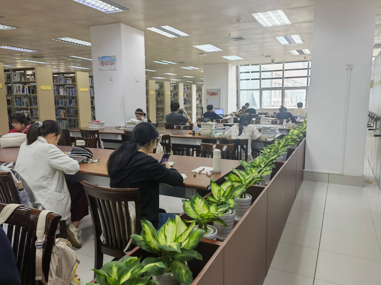 翠叶绿、君子兰、吉姆蕨等八种绿色观赏植物点缀在图书馆走廊里、墙角边、书架和桌面等各个角落,与图书馆特有的氛围、装饰相呼应,令人赏心悦目,增添了清新的自然气息与文化氛围。读者小黄说道,在阅读之余抬头即见生机盎然的绿植,顿时感觉学习压力没那么大了,精神得到提振,学习动力更强了。