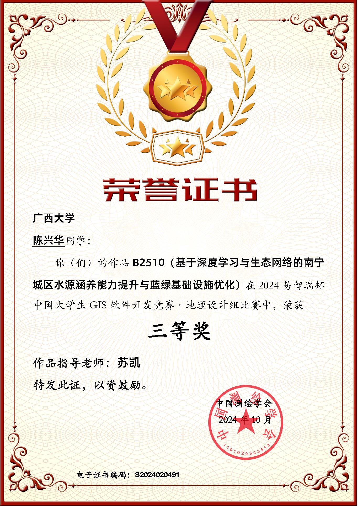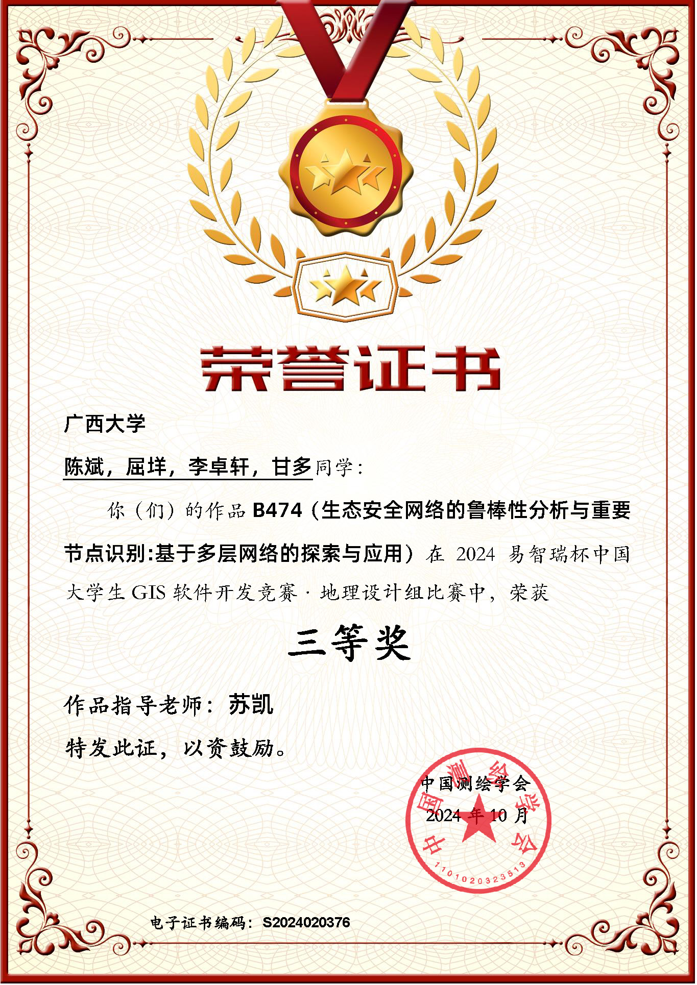 近日,2024年“易智瑞杯”中国大学生GIS软件开发竞赛地理设计组评选结果正式揭晓!由beat365官网苏凯老师指导的作品《生态安全网络的鲁棒性分析与重要节点识别:基于多层网络的探索与应用》(参赛学生:陈斌、屈垟、甘多、李卓轩)和《基于深度学习与生态网络的南宁城区水源涵养能力提升与蓝绿基础设施优化》(参赛学生:陈兴华),获地理设计组三等奖。