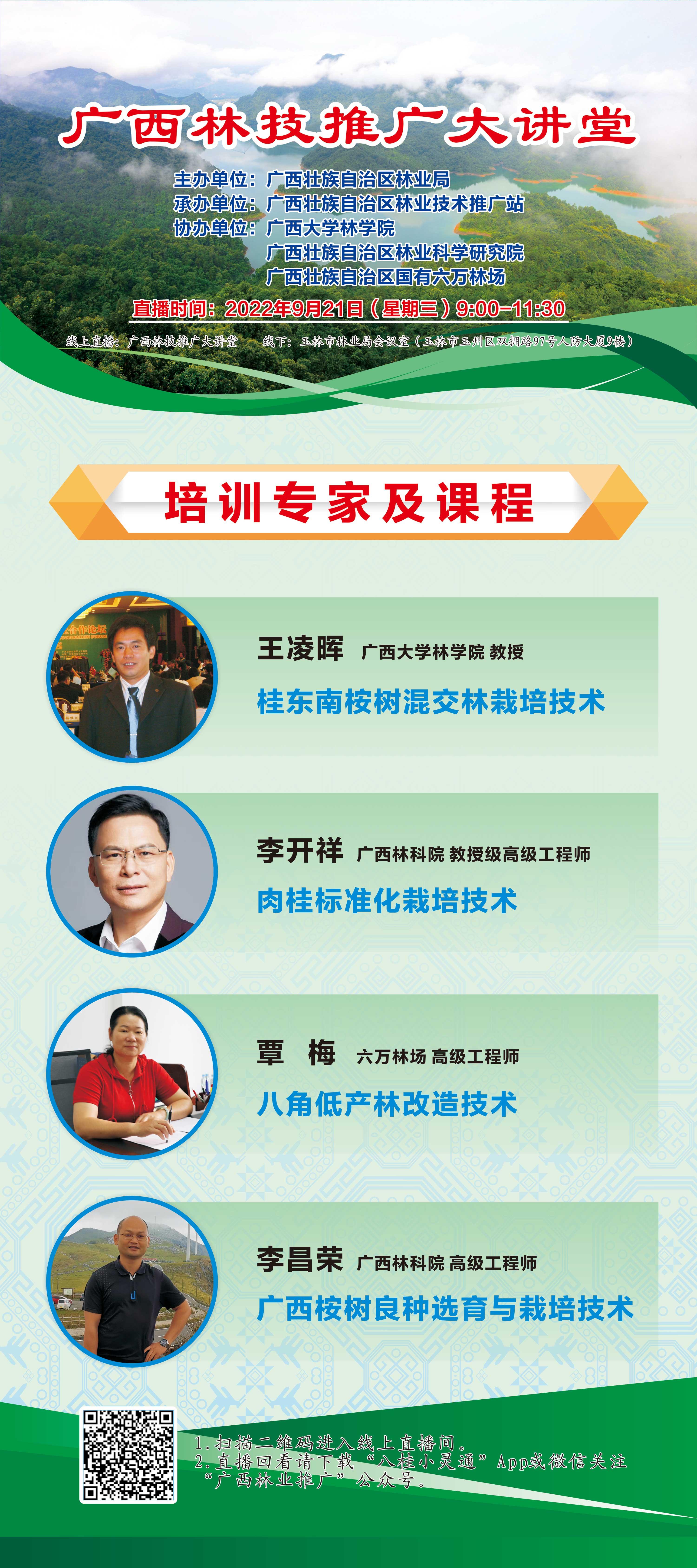 由广西壮族自治区林业局主办,beat365官网作为协办单位之一的广西林技推广大讲堂第2期于9月21日(星期三)上午9时通过线上和线下两种方式开讲,线上直播可通过微信扫码方式进入,欢迎beat365官网师生进入课堂听课。