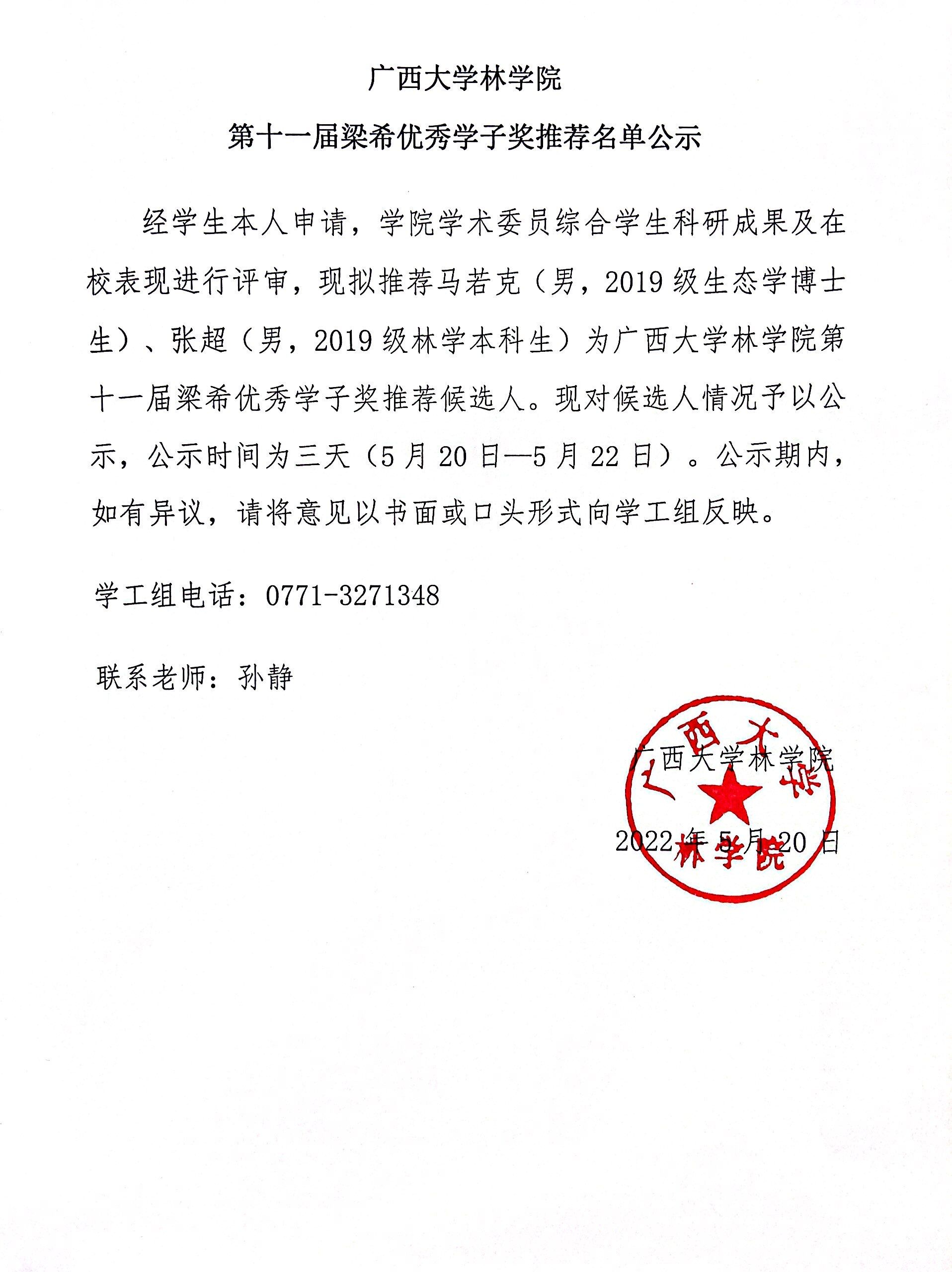 beat365平台官方网站第十一届梁希优秀学子奖推荐名单公示