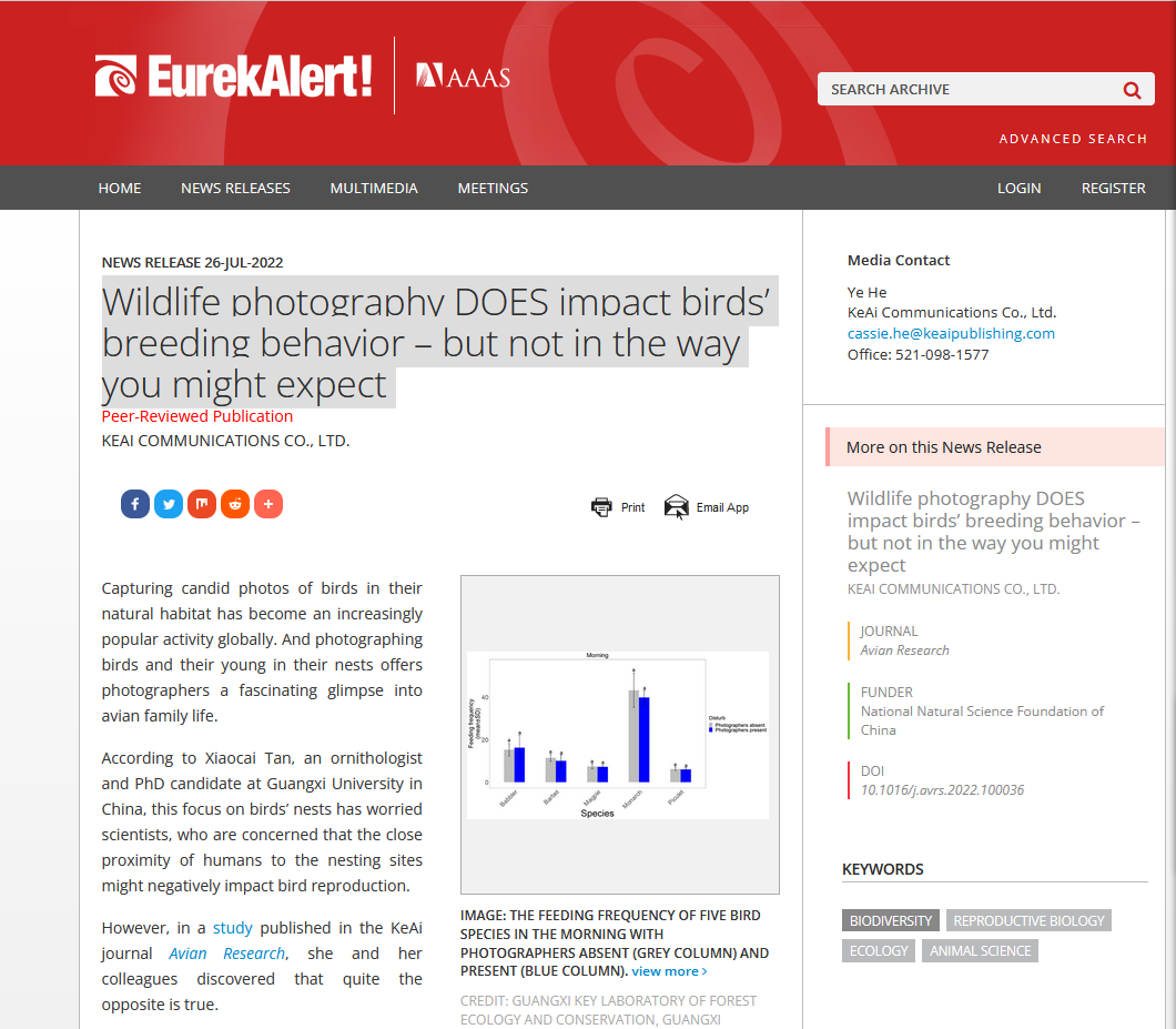 近期,《Avian Research》发表beat365官网喀斯特森林鸟类科研成果“Does bird photography affect nest predation and feeding frequency?”,beat365官网生态学博士生谭筱彩为第一作者,蒋爱伍副教授为该研究论文的通讯作者。文章上线后,美国科学促进会(AAAS)主办的全球科学新闻发布平台“EurekAlert!”以“Wildlife photography DOES impact birds breeding behavior – but not in the way you might expect”为题对该成果进行了报道,认为该研究加深对野生动物摄影及潜在效应的认识,对喀斯特森林生物多样性保护具有重要的意义。