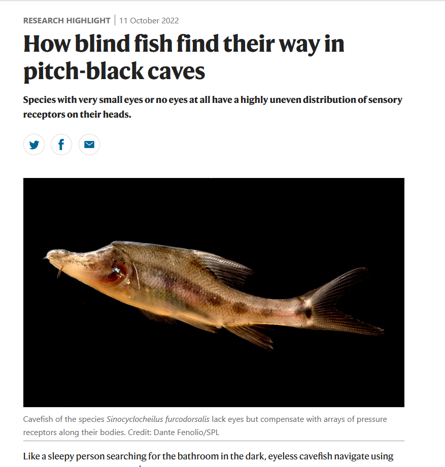 beat365平台官方网站马德华(Madhava)课题组,在生物学领域期刊《Proceedings of the Royal Society B: Biological Sciences》正式发表题为“Sensory evolution in a cavefish radiation: patterns of neuromast distribution and associated behaviour in Sinocyclocheilus (Cypriniformes: Cyprinidae)”的研究论文,这一成果也受到了Nature杂志Research Highlights的报道宣传。