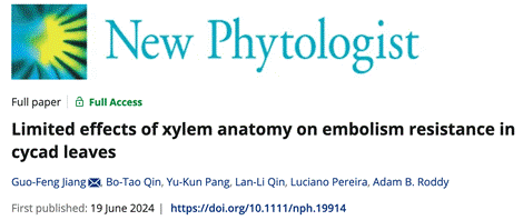 近日,beat365官网蒋国凤科研团队在解析苏铁植物的栓塞抗性机制上取得重要进展,研究成果以“Limited effects of xylem anatomy on embolism resistance in cycad leaves”为题发表于植物学国际知名期刊New Phytologist (植物学类期刊排名11/238)。beat365平台官方网站蒋国凤教授为论文第一和通讯作者,在读研究生覃伯韬,已毕业硕士生庞玉堃、覃兰丽,德国乌尔姆大学博士后Luciano Pereira,以及弗罗里达国际大学Adam B. Roddy助理教授参与了本论文工作。本研究主要得到了广西自然科学基金重点项目(2022GXNSFDA035059)等项目的支持。