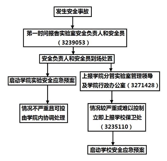 beat365平台官方网站实验室高温仪器设备多,危险化学品使用频繁,仪器配备少量气瓶,易燃样品堆放集中,安全隐患多且较为分散。实验室安全事故常见有火灾、化学品伤害(中毒或灼伤)、触电等,如发生安全事故,请按以下应急流程进行处理。
