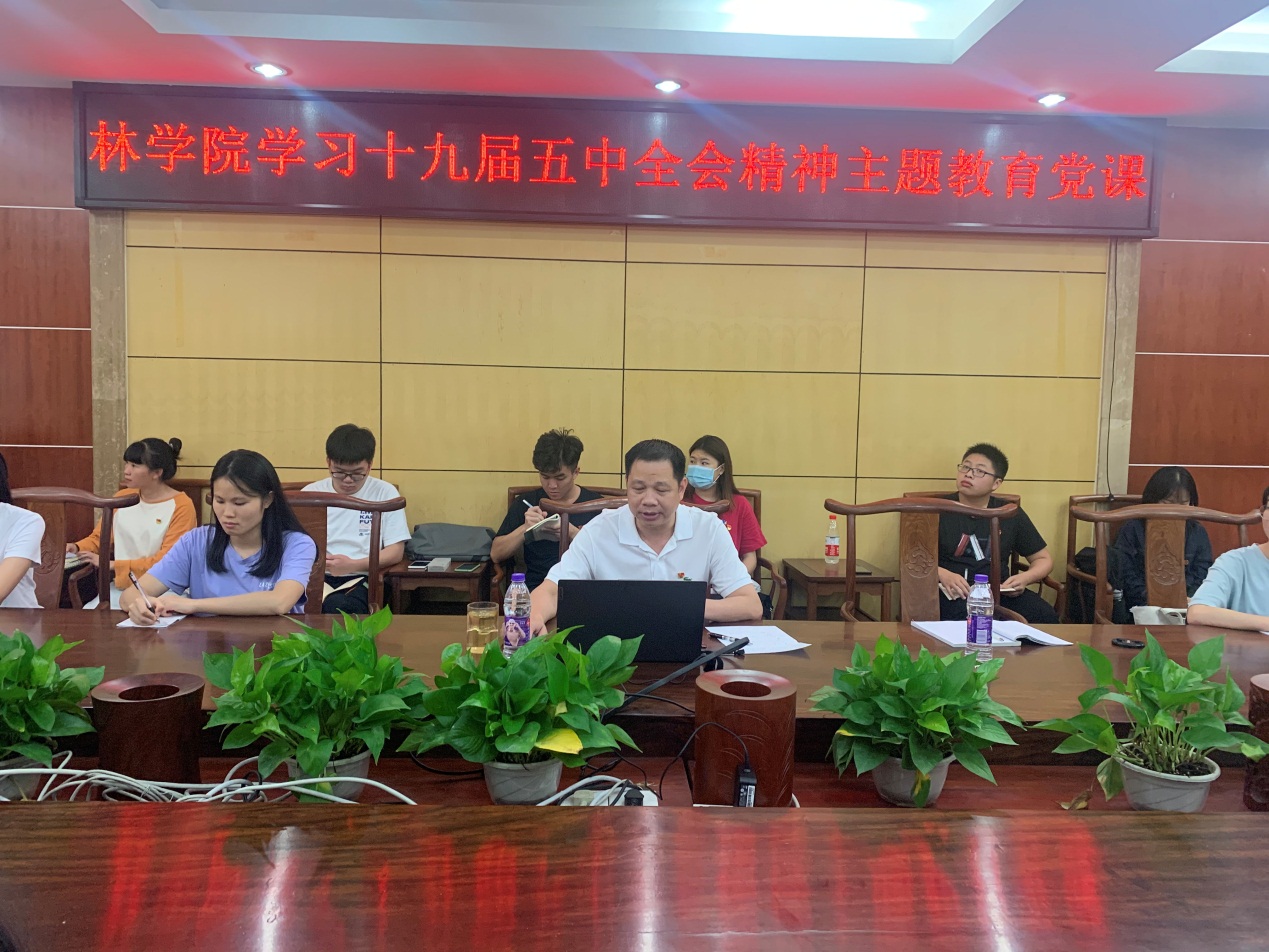 11月20日下午,beat365官网党委书记覃宪儒在beat365平台官方网站二楼会议室以“党的十九届五中全会精神解读”为题,给beat365平台官方网站林学本科生党支部全体党员讲授专题党课。