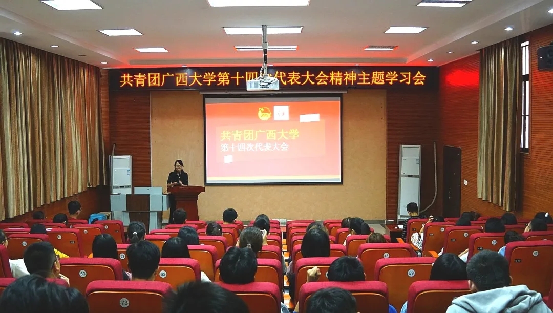 在会上,院团委书记银宁老师向同学们传达了我校第十四次团代会精神,带领大家学习了自治区党委教育工委专职副书记李晓勇、共青团广西区委书记李楚、校党委副书记查丹明等同志的讲话精神,学习了校团委书记谢能重代表共青团beat365平台官方网站第十三届委员会向大会所作的工作报告,传达学习了校第十四次团代会精神。
