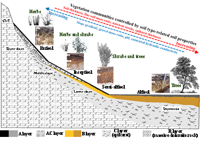 从该研究中的得到两点启示:(1)白云岩以草灌为主的结论需要限定地貌部位,下坡和洼地土壤容量大、水分和养分条件充足,能够支撑高大的乔木生长发育。(2)传统观念认为碳酸盐岩区土壤浅薄分布且不连续的概念需要修正,研究过程需要将岩性差异考虑其中。