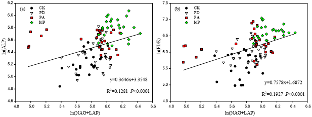 鉴于此,beat365官网研究团队选取广西南宁市马山县典型石漠化山区经过长期植被恢复的降香黄檀纯林(PD)、顶果木纯林(PA)和降香黄檀/顶果木混交林(MP)三种林分作为研究对象,并以相邻的天然保留地作为对照(CK),重点探究固氮树种单一和混交种植对石漠化山区表层土壤团聚体有机磷(Po)积累和转化的影响。结果表明,在石漠化山区,引入固氮树种单一或两种树种混交种植,对表层土壤(0-10cm)团聚体的理化性质、Po组分和微生物群落结构以及功能产生不同程度影响,其中两种固氮树种混交种植更能显著提高表层土壤团聚体Po的积累和有效性。Po组分主要受ALP、MBN和AM真菌的影响,在石漠化山区引入固氮树种进行植被恢复主要通过影响SOC、NO3--N、C/P、Actinobacteria和AM真菌,最终影响土壤P的转化。该研究强调了利用固氮树种混交种植对于恢复严重退化的石漠化山区土壤的重要性,该策略可用于提高我国石漠化山区土壤团聚体Po的积累和转化,从而可能有效促进地上植被的恢复和稳定性植物群落的构建。