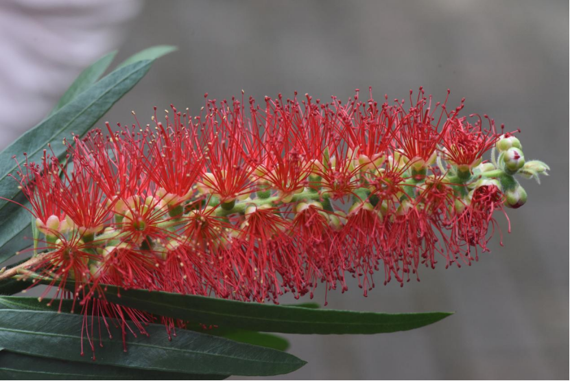 红千层的叶片互生,呈条形,质地坚硬,表面有明显的油腺点,揉搓后会散发独特的芳香。其花朵极为引人注目,穗状花序生于枝顶,花形奇特,呈圆柱形,好似一个个瓶刷悬挂在枝头。花朵颜色鲜艳,多为红色,也有少量粉色品种。花瓣小且呈卵形,众多密集的雄蕊伸出,犹如鲜艳的毛刷,花期主要集中在6-8月。